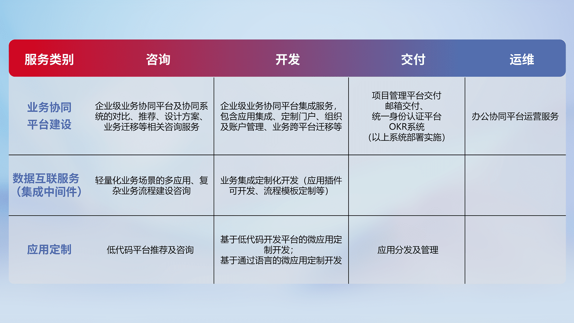 针对钉钉、、、企微、、IDaas等平台级产品提供产品的规划、、方案、、、、交付、、、定制化开发等服务,,实现如统一协同办公、、、智能客户服务、、混合会议管理、、智能数据查询、、等业务场景,,,实现数字化转型。。。